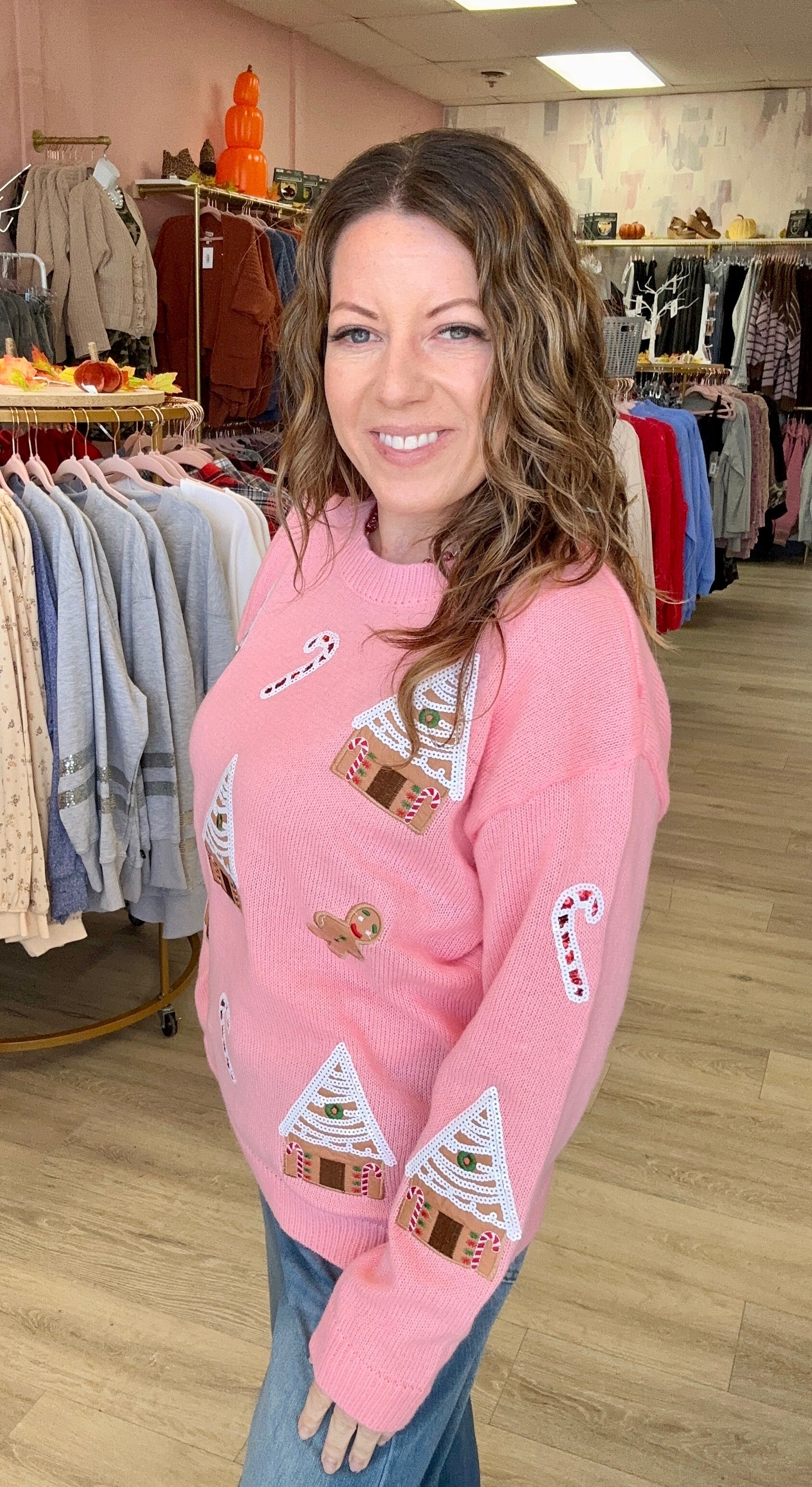 Bring the holiday cheer in the cutest way possible! This pink knit is decked out with gingerbread houses, candy canes, and little gingerbread men that scream Christmas cookie vibes. 🎄🍪 Cozy, oversized, and playful, it’s perfect for cookie swaps, tree decorating, or just rocking around the Christmas tree in style.