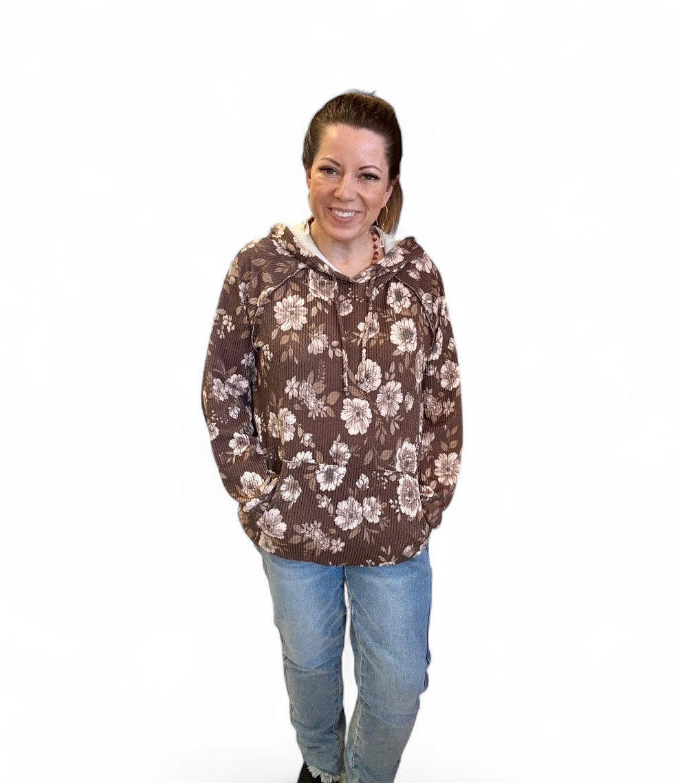 Stay cozy and stylish with our Corded Floral Hoodie by Hemish! Made with a soft blend of 95% polyester and 5% spandex, this hoodie features a drawstring hood, long puff sleeves, and a unique flocal print with a Button detailing on the front adds an extra touch of charm to this must-have wardrobe staple.