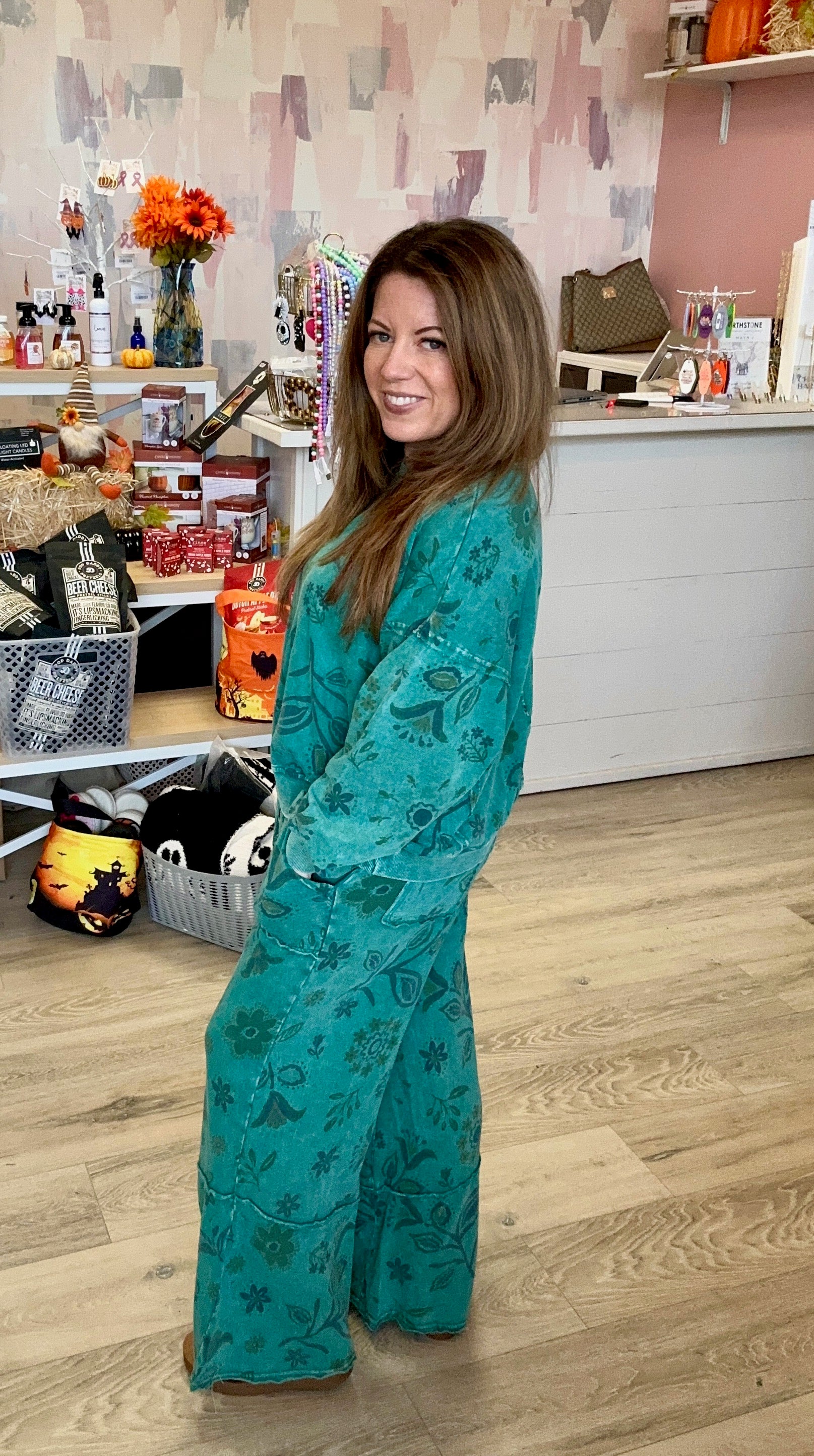 The deep front and back patch pockets add both function and style, while the all-over floral print makes them a standout piece whether you’re lounging or out and about. Available in teal or ash, they’re the perfect way to add a little personality to your casual wardrobe.