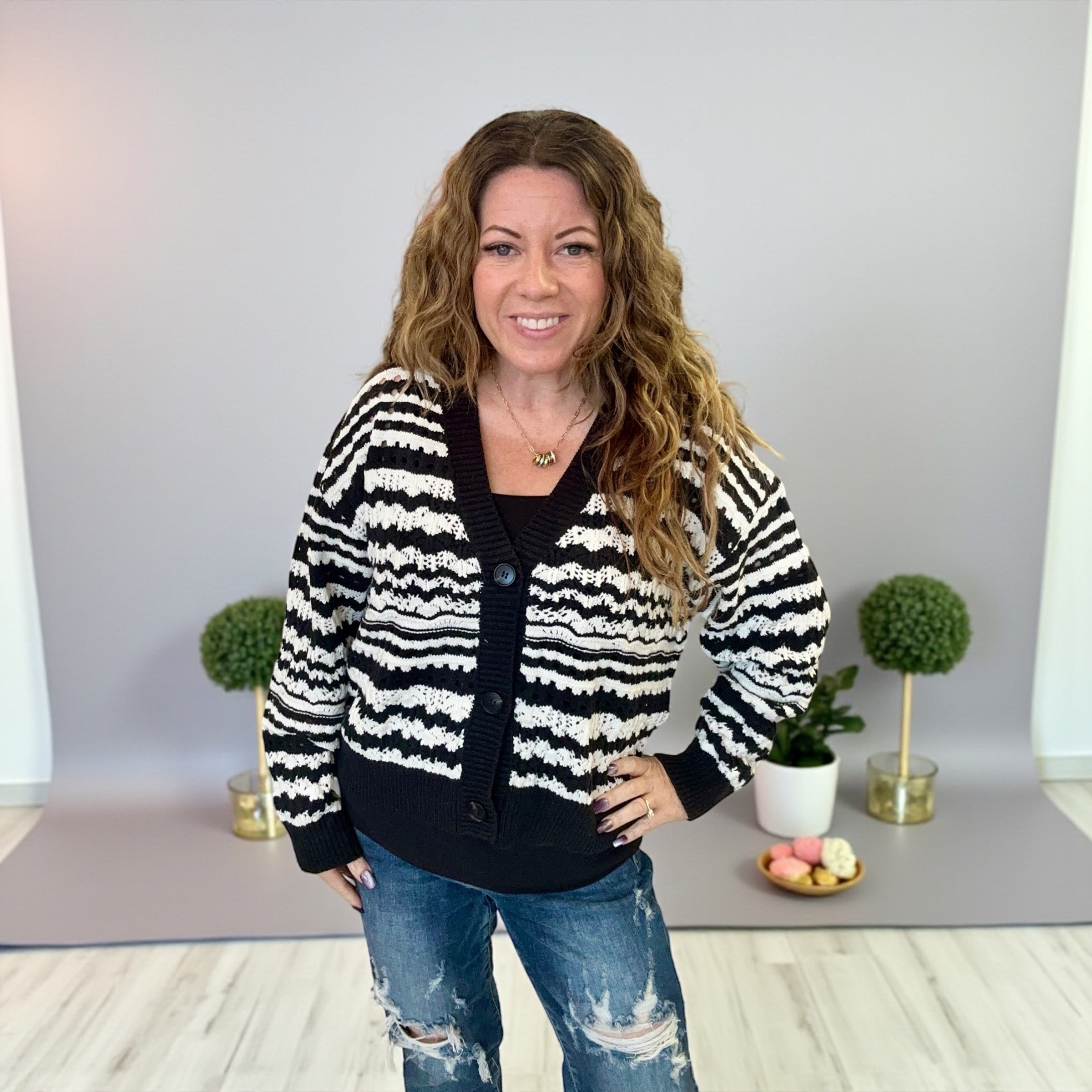 Spice up your wardrobe with this quirky, striped cardigan in ivory and black. Whether you're running errands or going out for a night out, this cardigan will add a playful touch to any outfit. Stay stylish and cozy with this must-have piece.