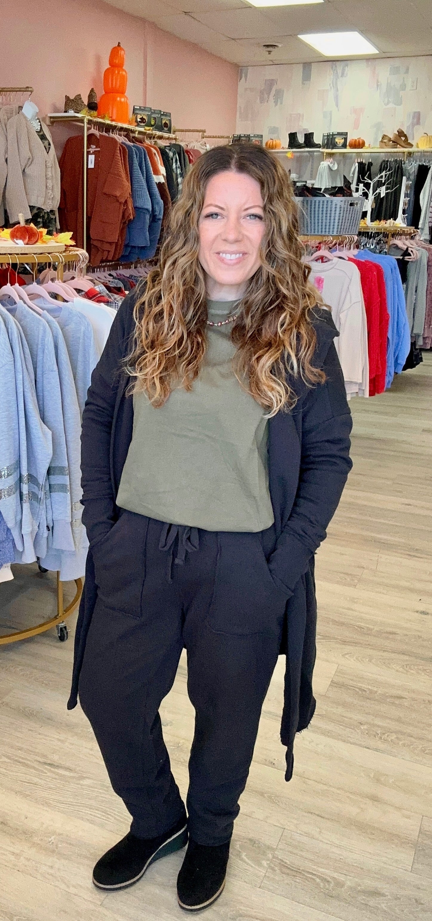 ✨ Look stylish while being comfy! What more could you ask for? The perfect on the go pants for any activity! Pair it with our fuzzy socks and blanket and you have the perfect chill combo 🎥