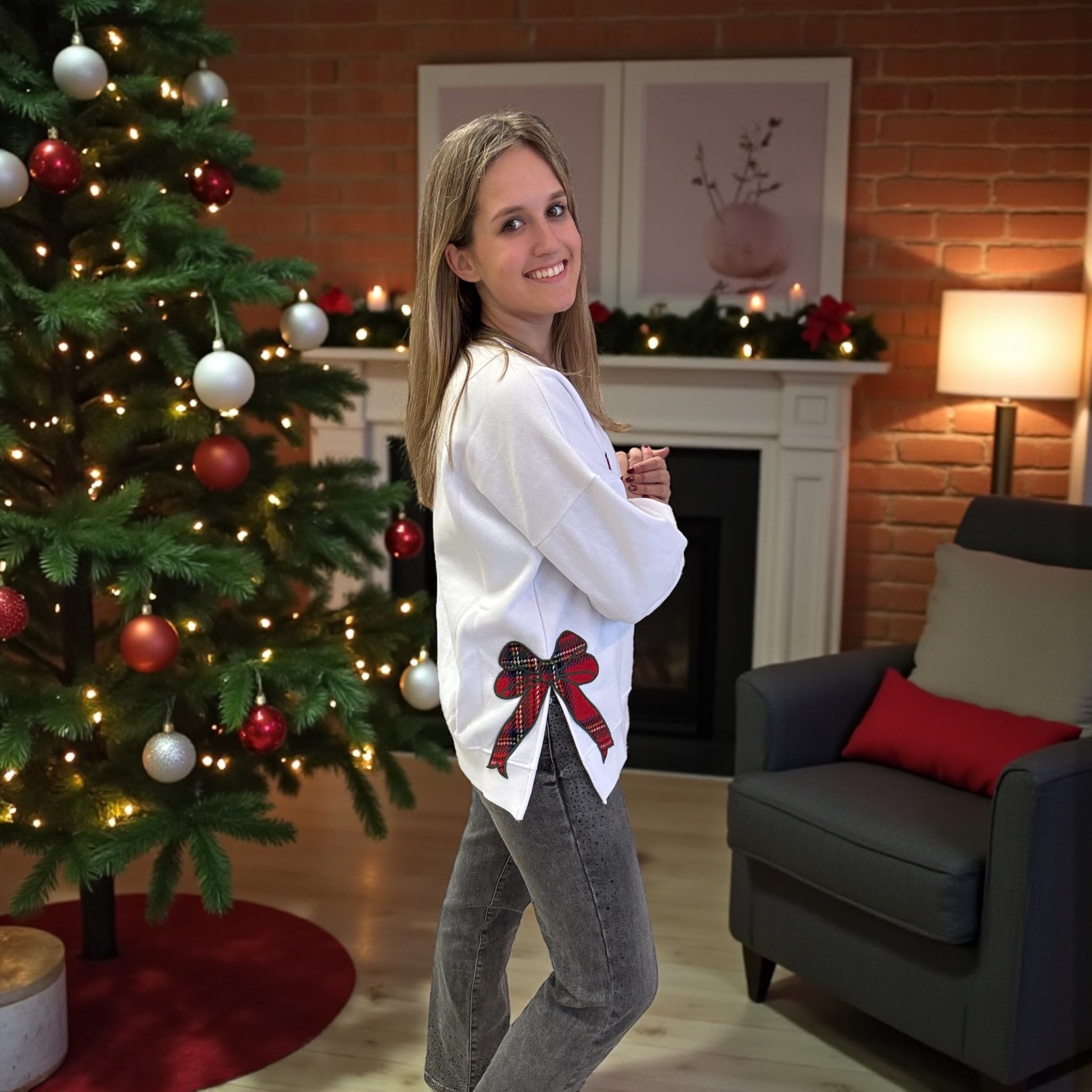 Unleash your festive spirit in our Christmas Plaid Merry Side Bow Patches Sweatshirt. The cozy fleece material will keep you warm, while the playful side bow patches and cheerful "Merry" detailing add a touch of holiday cheer. Perfect for spreading joy and staying cozy this holiday season!