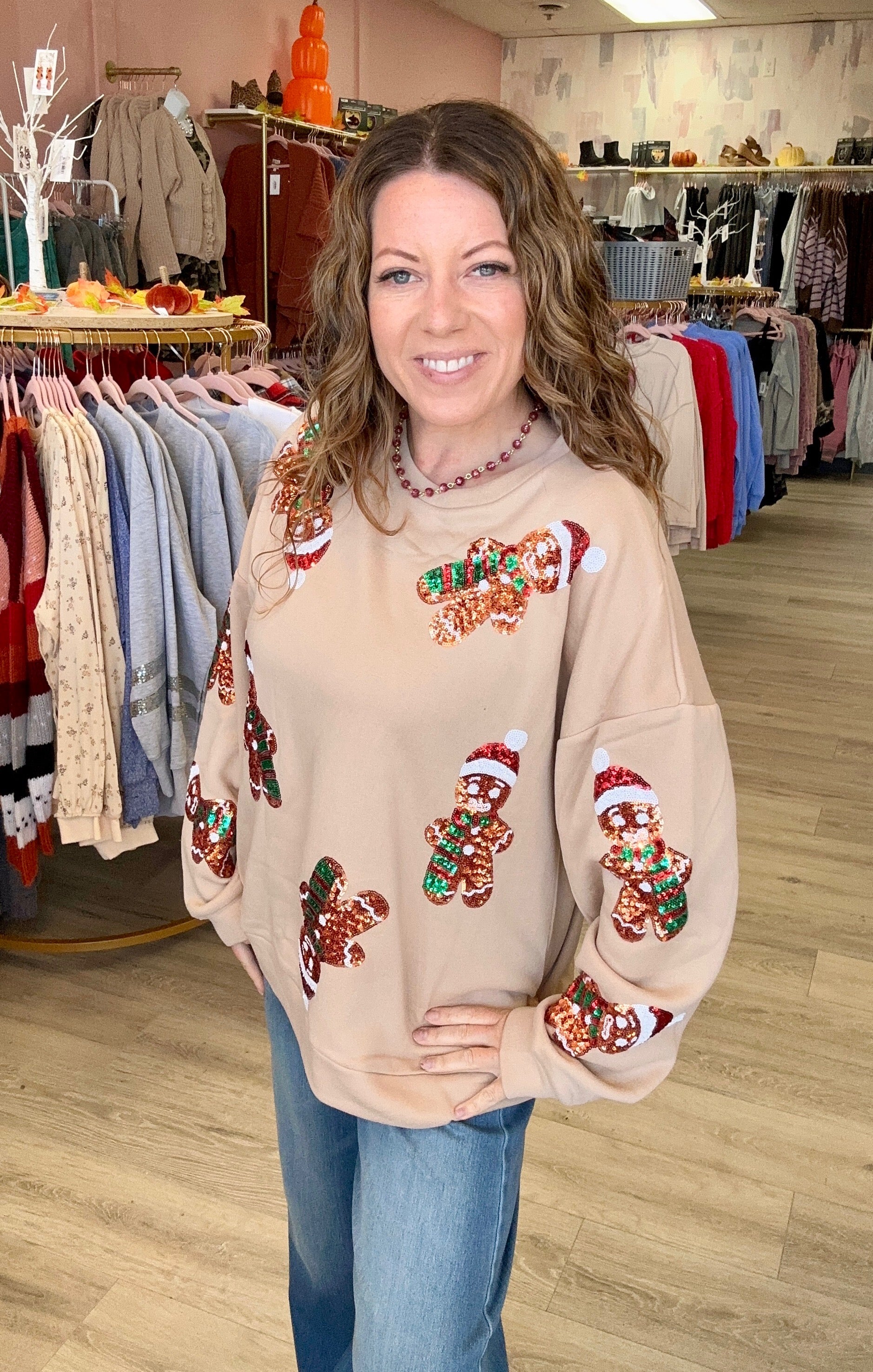 🎄 Embrace the festive spirit with our Sequin Gingerbread Man Embroidered Christmas Fleeve Pullover in oatmeal. Featuring adorable gingerbread man designs, this fleece pullover adds a touch of fun to your holiday wardrobe. Stay cozy and stylish this Christmas season! Styled perfectly with a pair of our Judy Blues or Leggings!