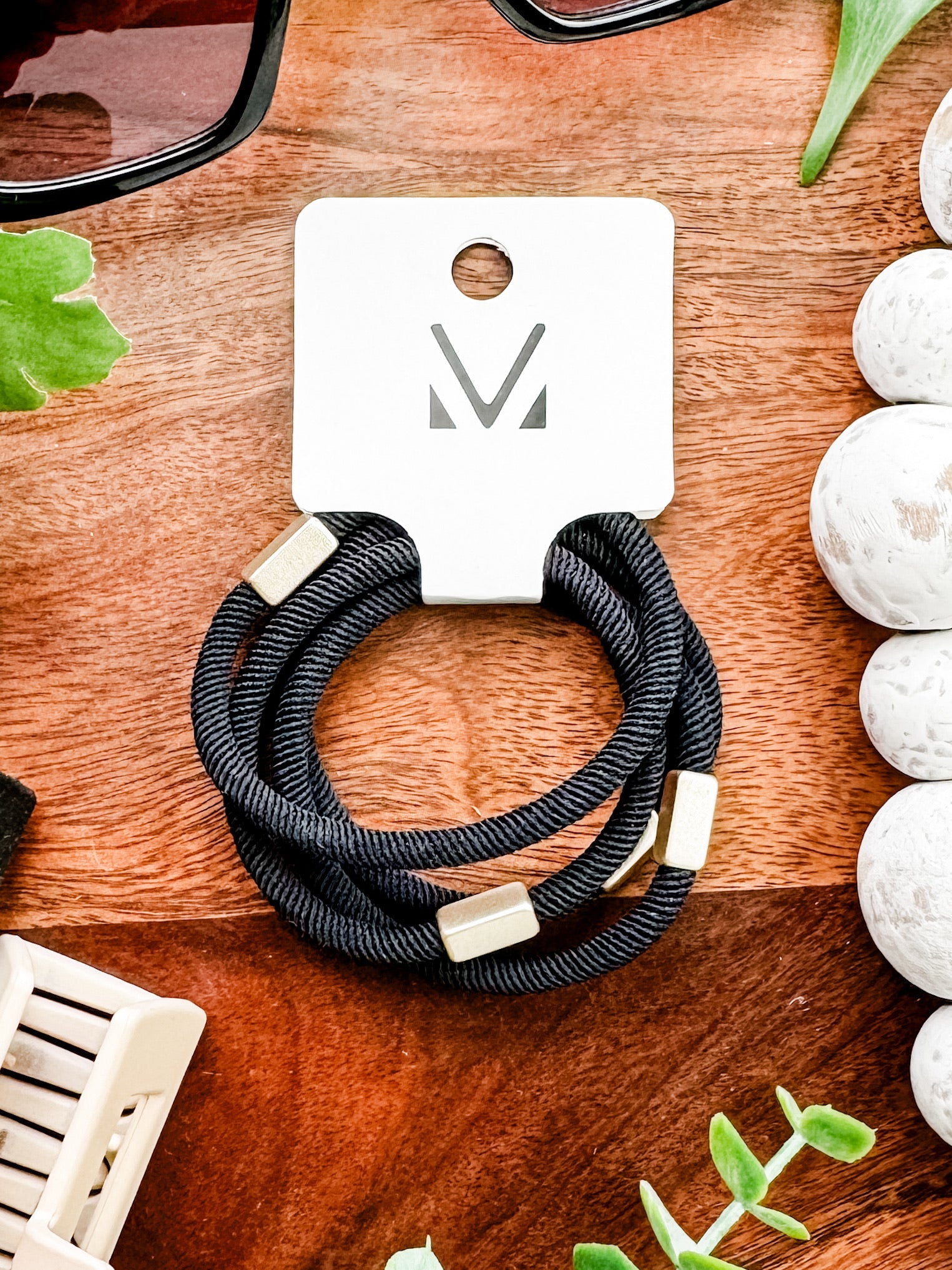 Stay classy with our neutral gold accents hair tie bracelet set. This set of five elastic ties combines elegant gold details with a versatile neutral palette, making them perfect for any look. Wear them as stylish bracelets or functional hair ties.