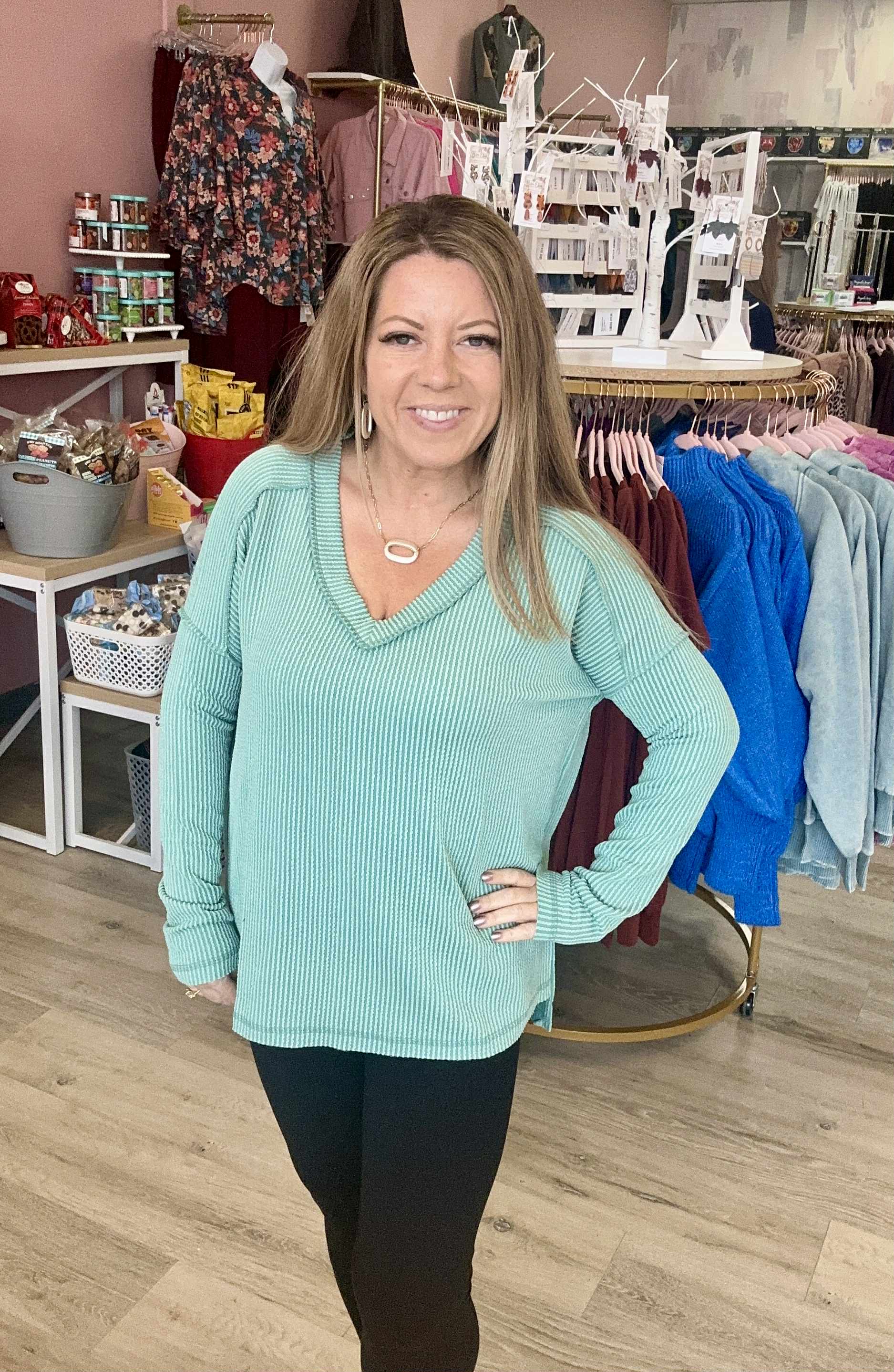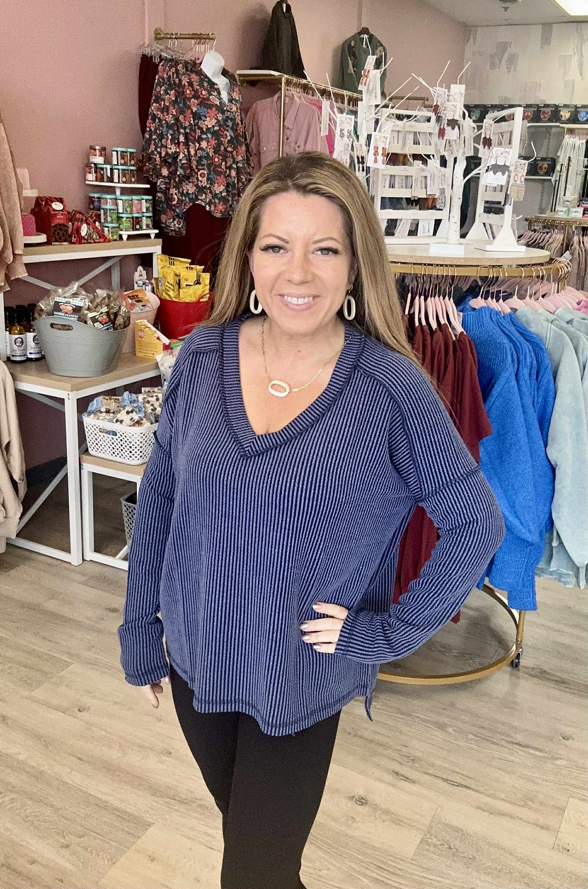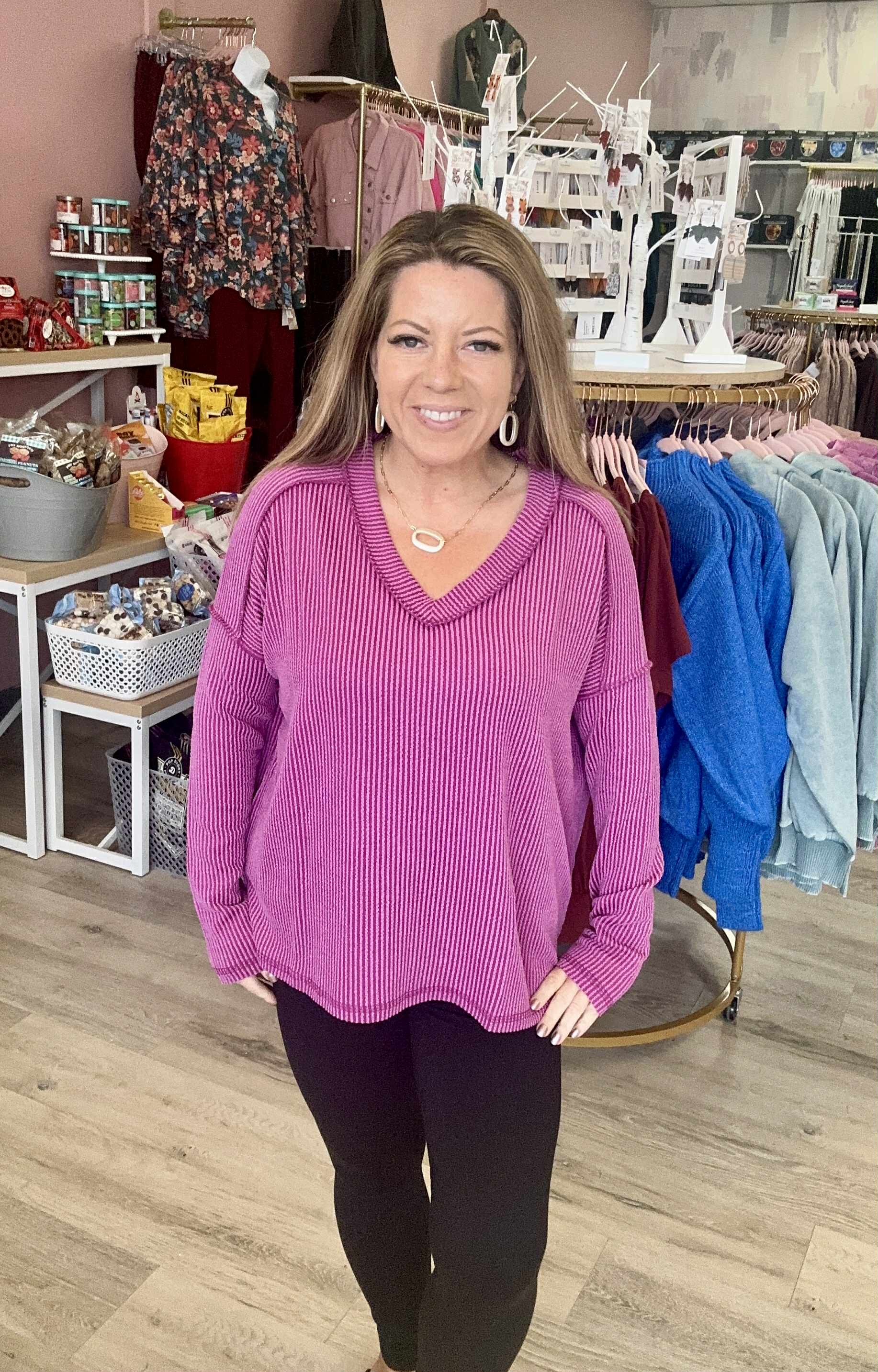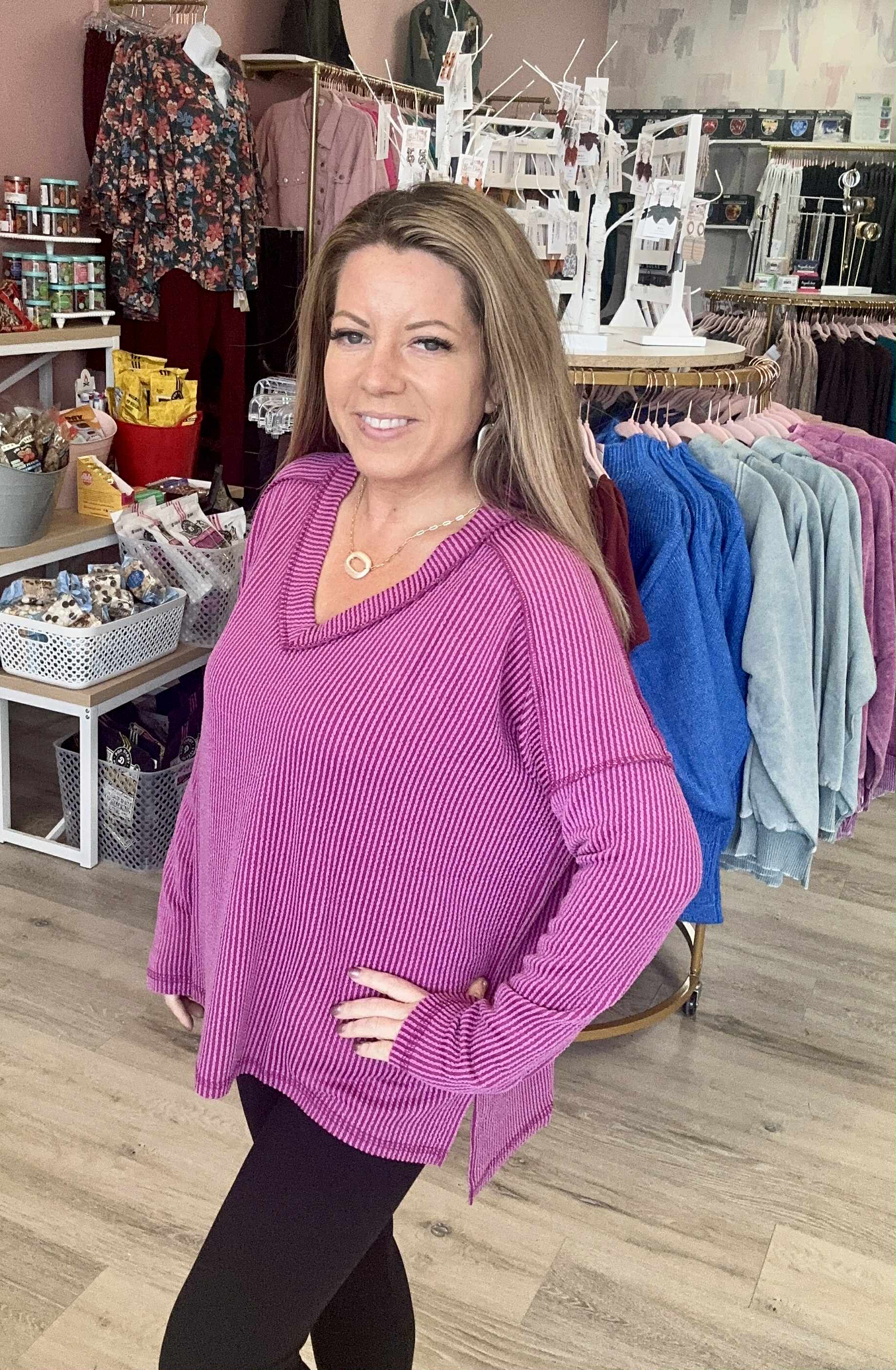 Add texture and style to your wardrobe with the Corded Hi-Low Top, featuring a unique corded ribbed design and long sleeves for cozy warmth. The flattering hi-low hem adds a modern twist, perfect for layering or wearing on its own. Crafted from soft, breathable fabric, this top offers comfort and versatility, making it ideal for casual outings, workdays, or weekend relaxation. Pair it with jeans or leggings for an effortlessly chic look.True to size.