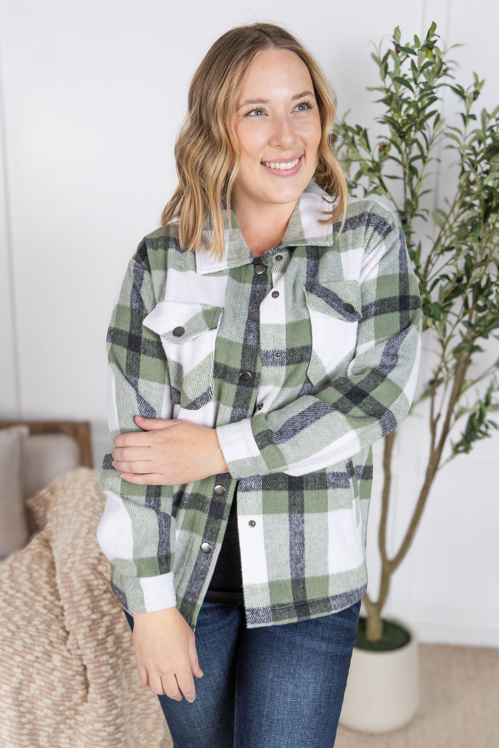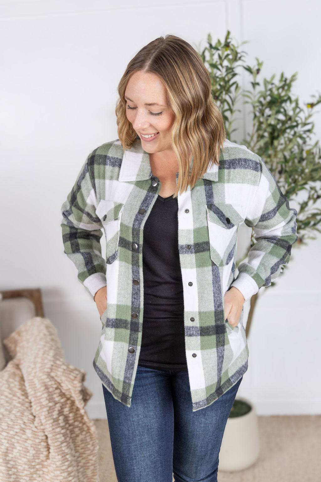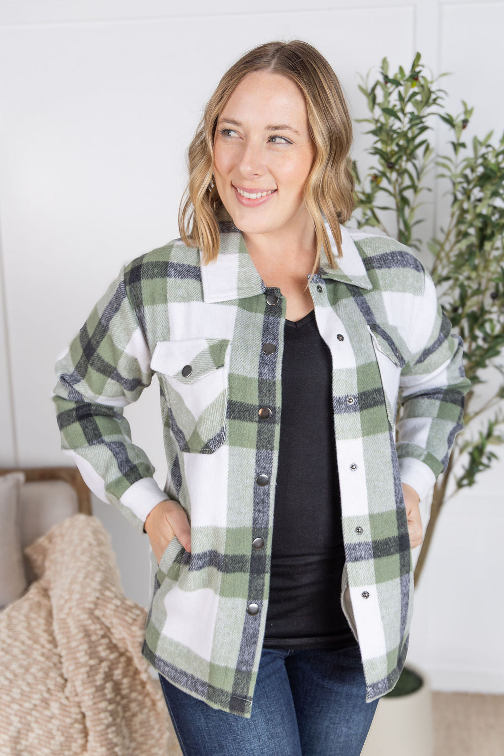 Meet Norah, our custom-cut shacket! This is a Michelle Mae exclusive, and you cannot get our fit anywhere else! This has a relaxed fit design, making it great for layering. It has features of a straighter bottom hem, snap buttons that are functioning and the two front upper pockets are fold over, functioning pockets with a snap button!