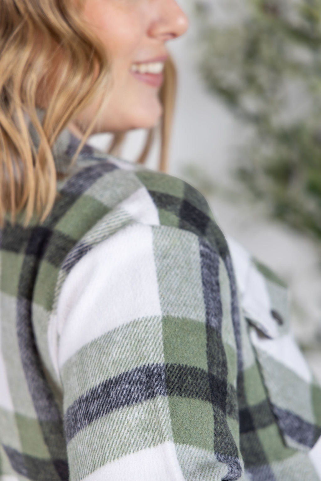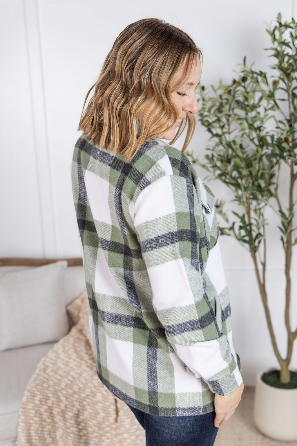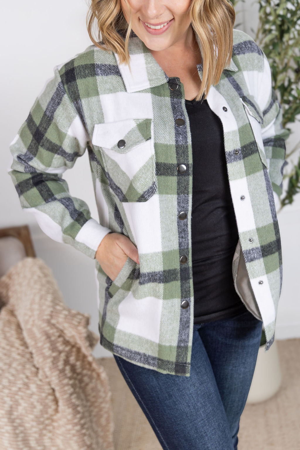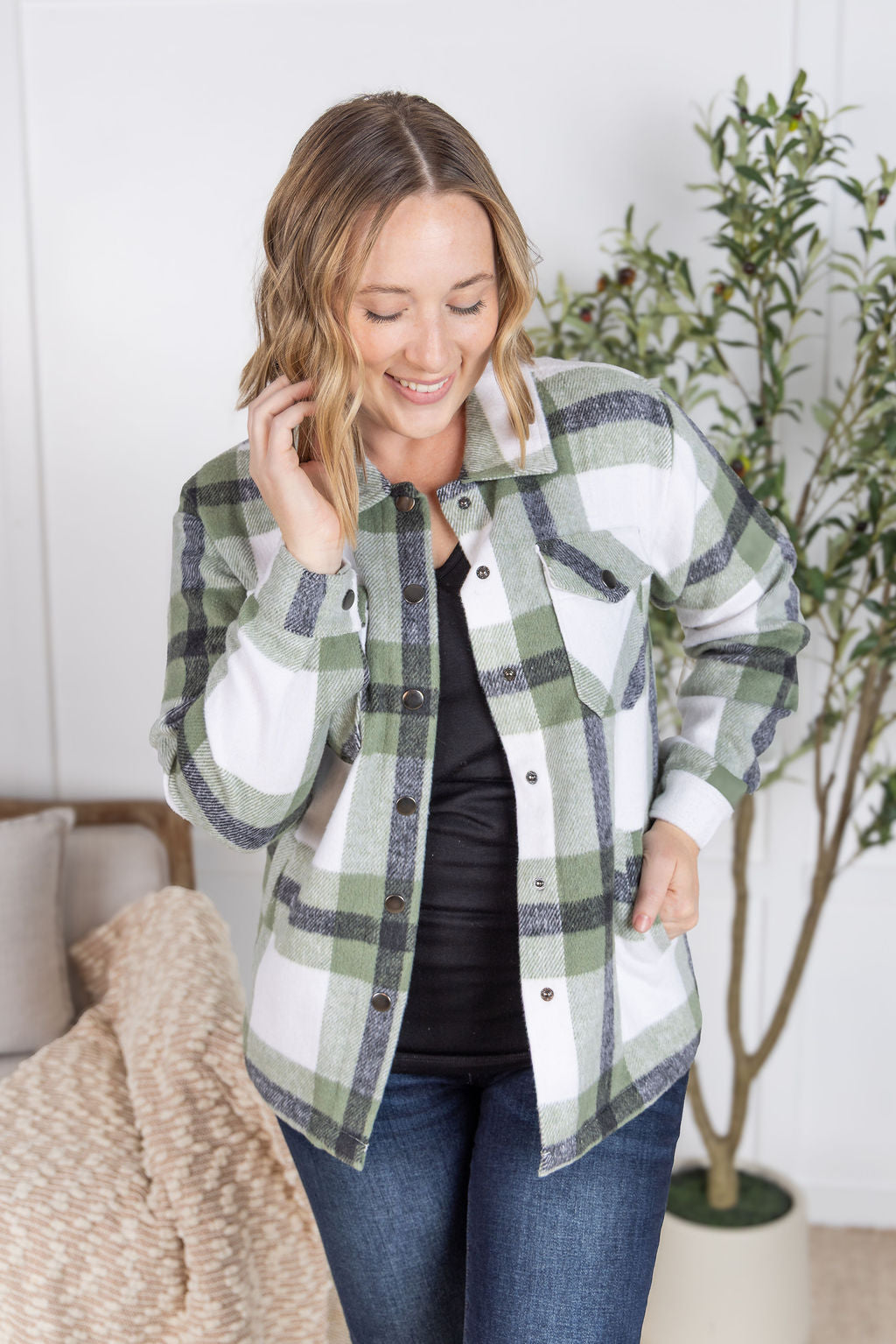 Meet Norah, our custom-cut shacket! This is a Michelle Mae exclusive, and you cannot get our fit anywhere else! This has a relaxed fit design, making it great for layering. It has features of a straighter bottom hem, snap buttons that are functioning and the two front upper pockets are fold over, functioning pockets with a snap button!