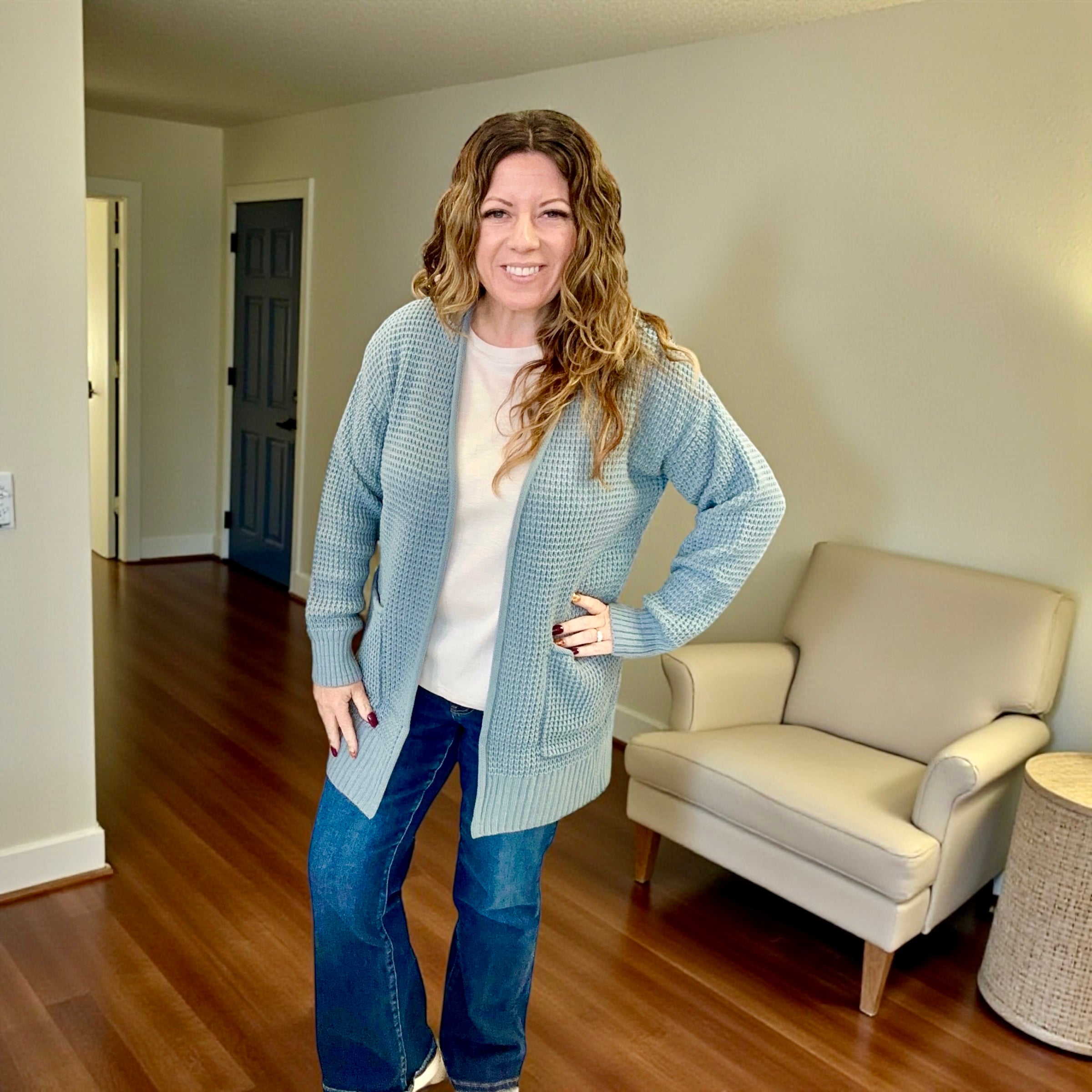 Get cozy in style with our Blue Grey Cardigan! This quirkycolored cardigan is perfect for adding a pop of color to your wardrobe. With its loose, relaxed fit you'll be both comfortable and fashionable. Upgrade your look today!