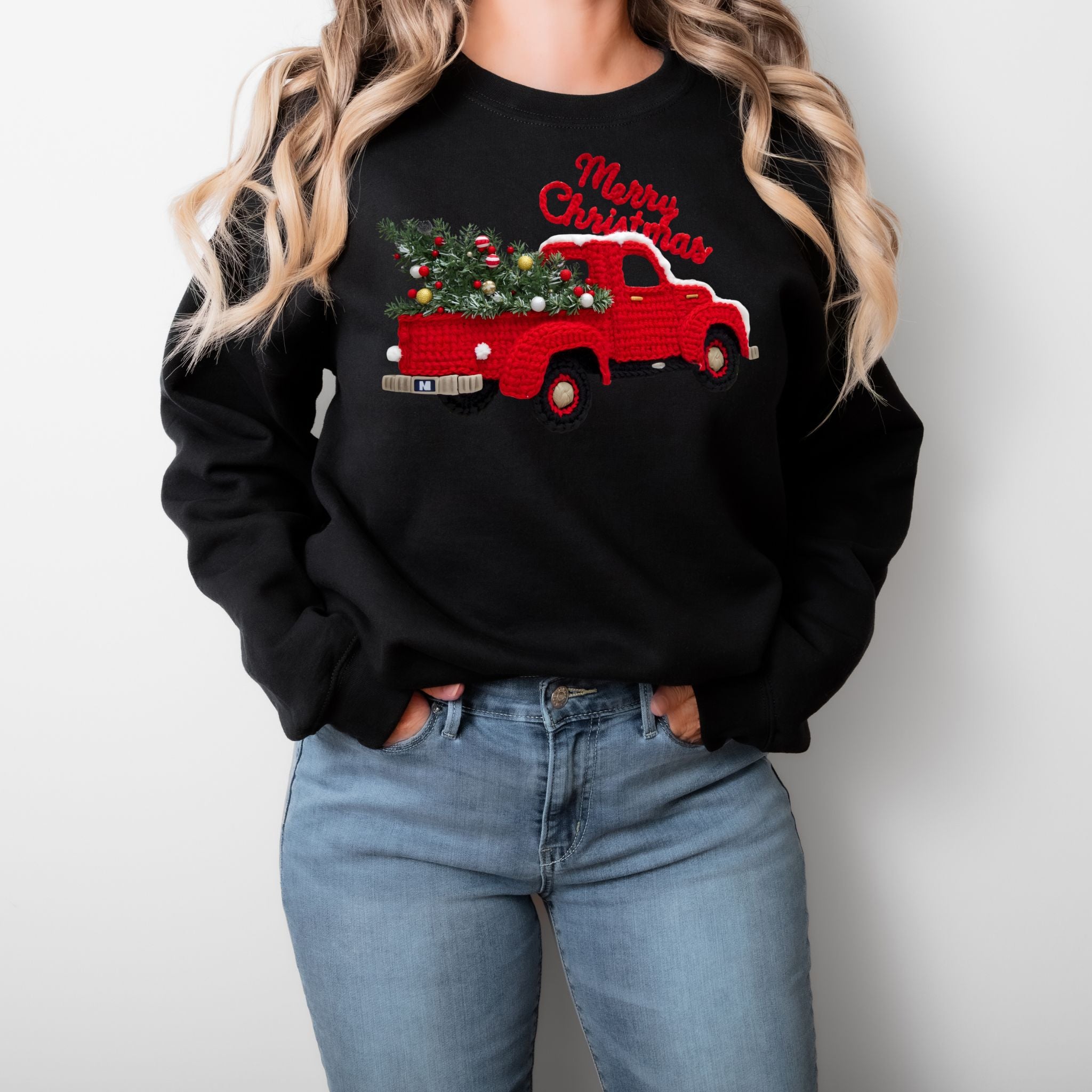 Get into the holiday spirit with our Merry Christmas Faux Yarn Truck Crew Sweatshirt. This cozy sweatshirt features a fun Christmas truck design and the words "Merry Christmas" in a playful faux yarn font. Perfect for all your festive gatherings. (Warning: may cause excessive holiday cheer!)