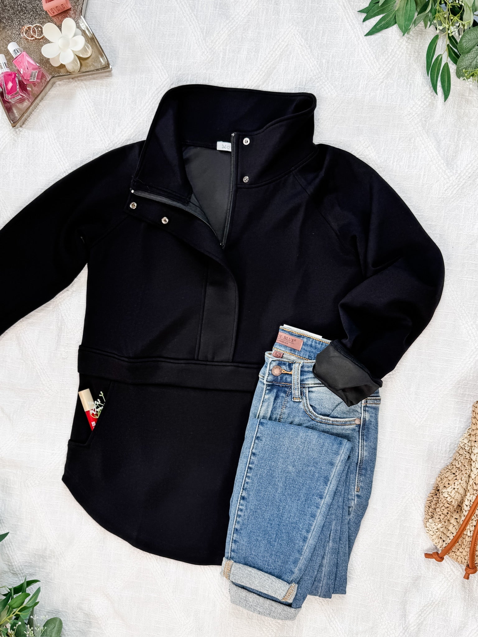 Unleash your playful side with the Mia Scuba Halfzip. Made from scuba fabric, this pullover features a faux center lappet, halfzip, pockets, and two snap buttons at the collar for extra warmth. With a curved hemline and cuff sleeves, it's perfect for adding a touch of quirk to any outfit. (And yes, it's as fun to wear as it sounds!)