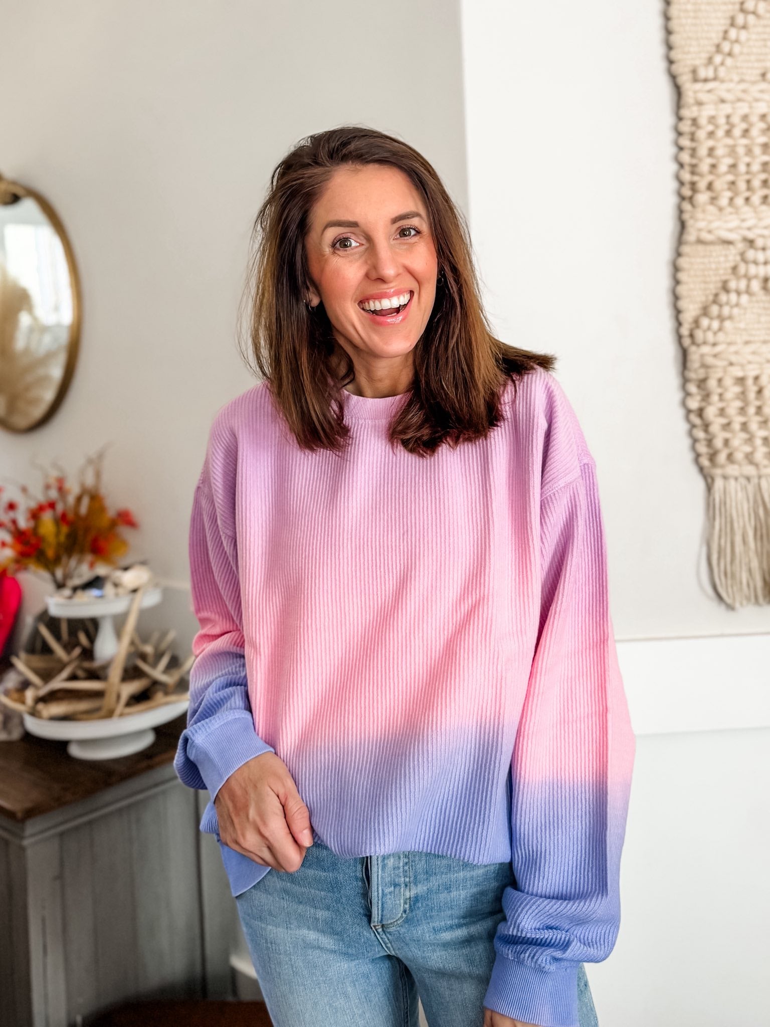Elevate your everyday style with the Moon Ryder Corded Essential Lux Crew. Crafted with a soft, corded texture, this crewneck blends pink, purple, and blue tones for a colorful yet sophisticated look. Perfect for layering or wearing solo, it brings a playful touch to your luxury wardrobe while ensuring comfort and effortless chic.
