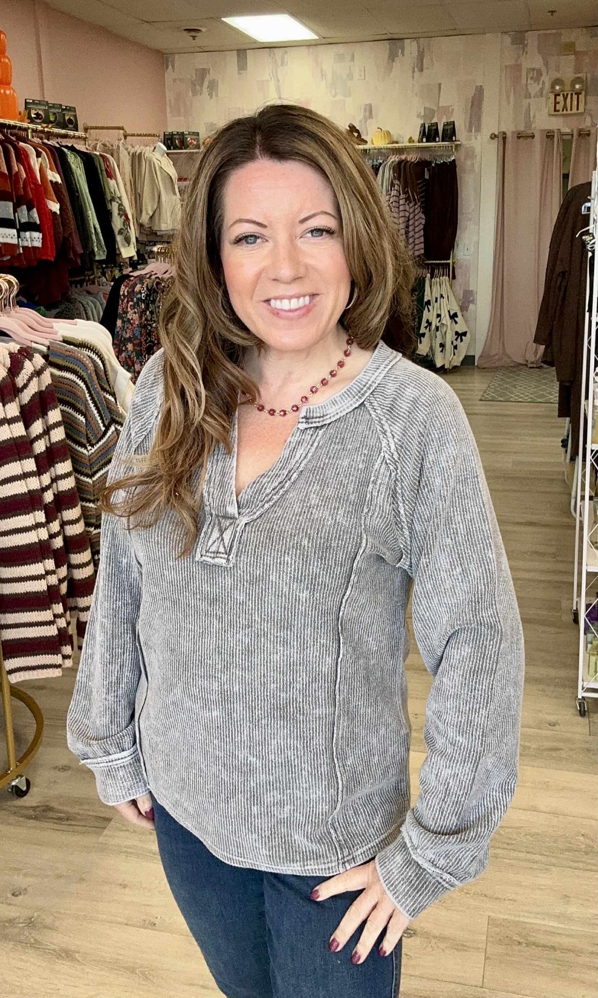 Add effortless style to your wardrobe with the Ribbed Split Neck Top, featuring a soft washed ribbed fabric and long sleeves for all-day comfort. The flattering split neck design adds a modern touch, making it perfect for layering or wearing on its own. Pair it with jeans, skirts, or trousers for a versatile look that transitions seamlessly from casual outings to dressier occasions.