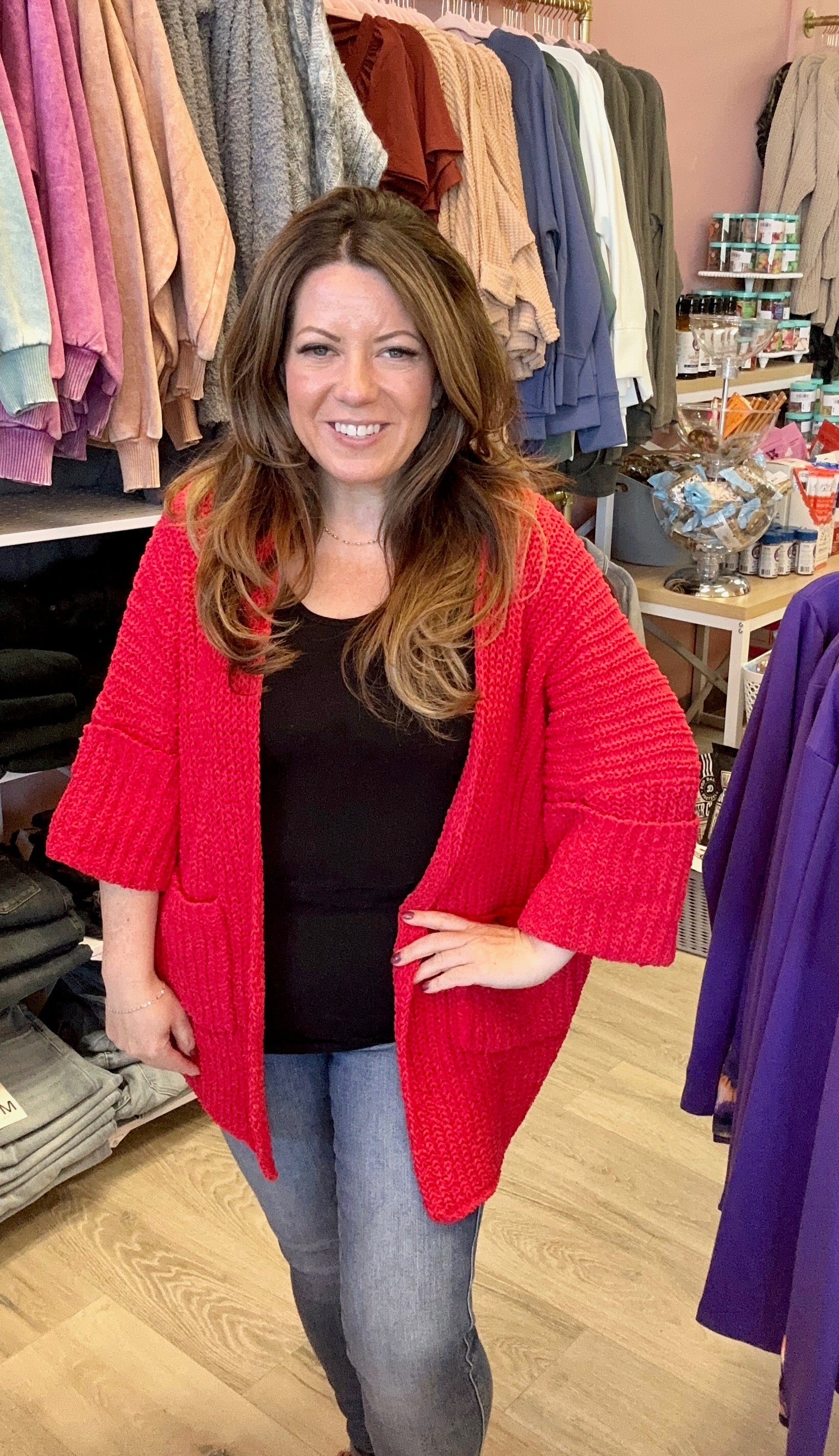 Add warmth and style to your wardrobe with this ruby-colored cardigan. Featuring long sleeves for cozy coverage and convenient pockets for your essentials, it's perfect for layering on cooler days. The rich hue complements any outfit, making it a versatile staple you'll reach for again and again.