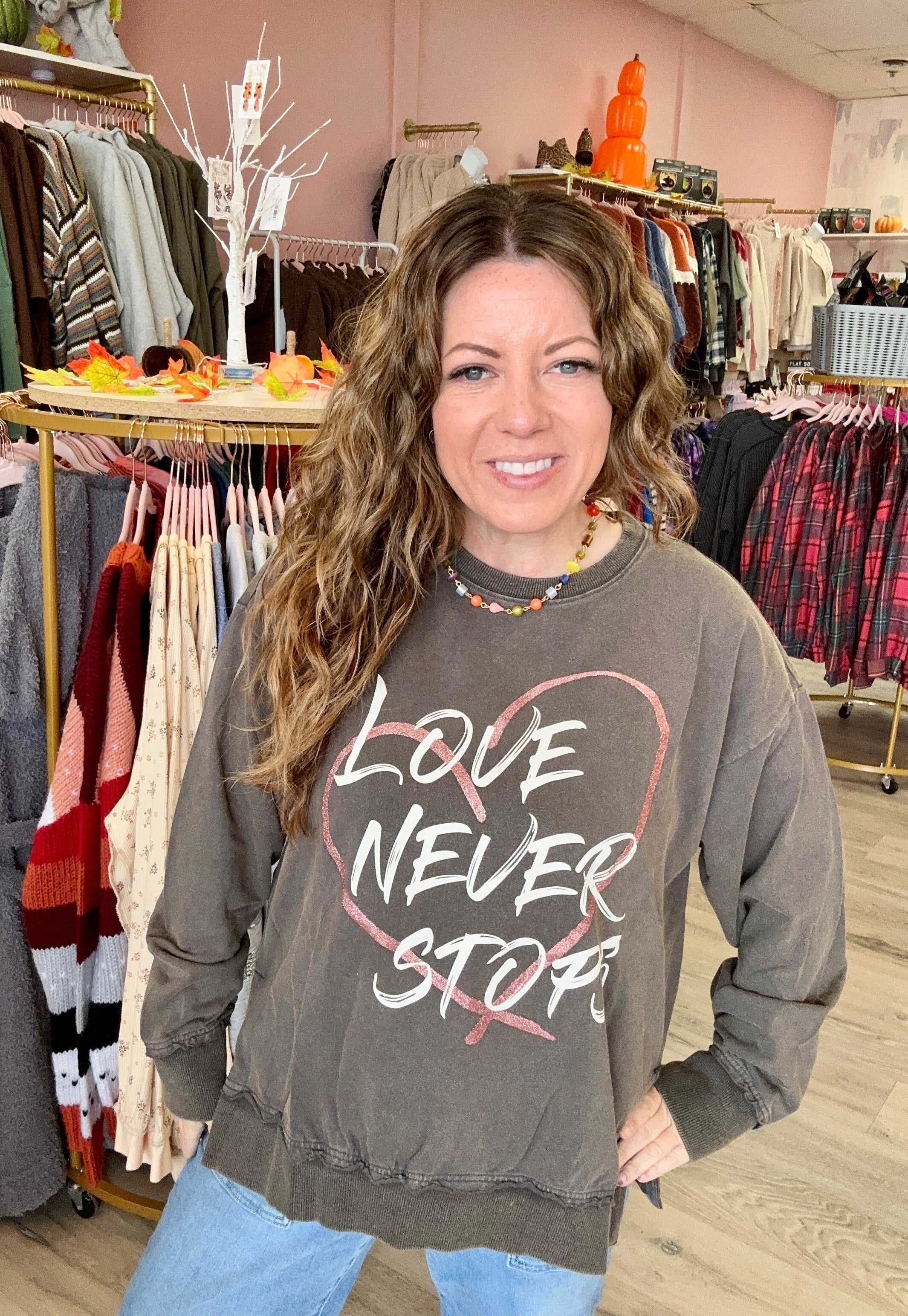 Stay cozy and stylish with the Love Never Stops Sweater, featuring a soft, comfortable fabric and a casual, relaxed fit. The graphic design adds a playful, uplifting touch, making it perfect for everyday wear or layering on chilly days. Pair it with jeans, leggings, or skirts for an effortlessly chic look that spreads positive vibes wherever you go.