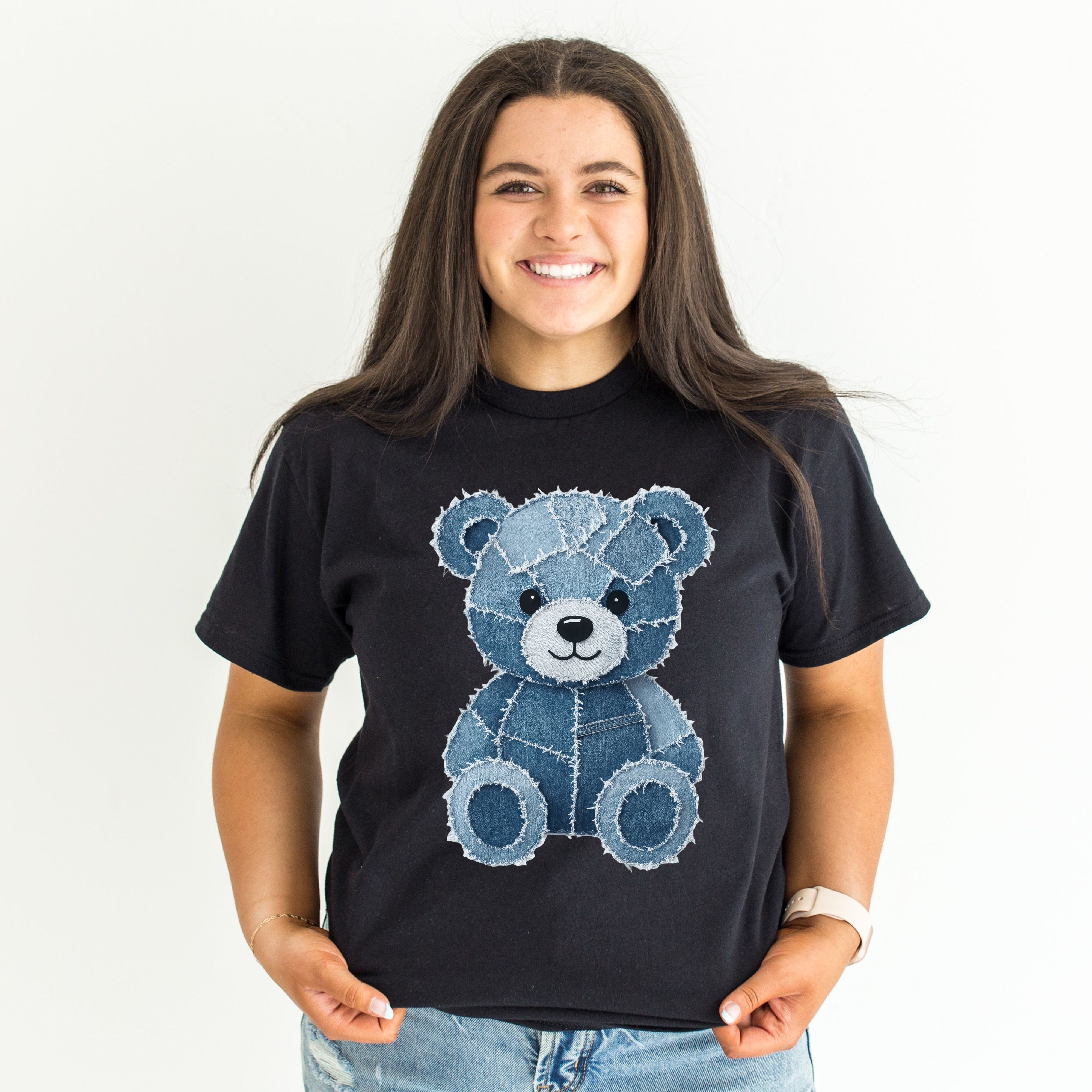 Get ready to rock a unique and stylish look with our Blue Jean Baby Crew Tee. Made with a patchwork design and features a cute bear graphic. This sweatshirt is perfect for adding some fun and personality to your wardrobe. (Possible Benefit: Stand out from the crowd, express your individuality with this playful and quirky tee)