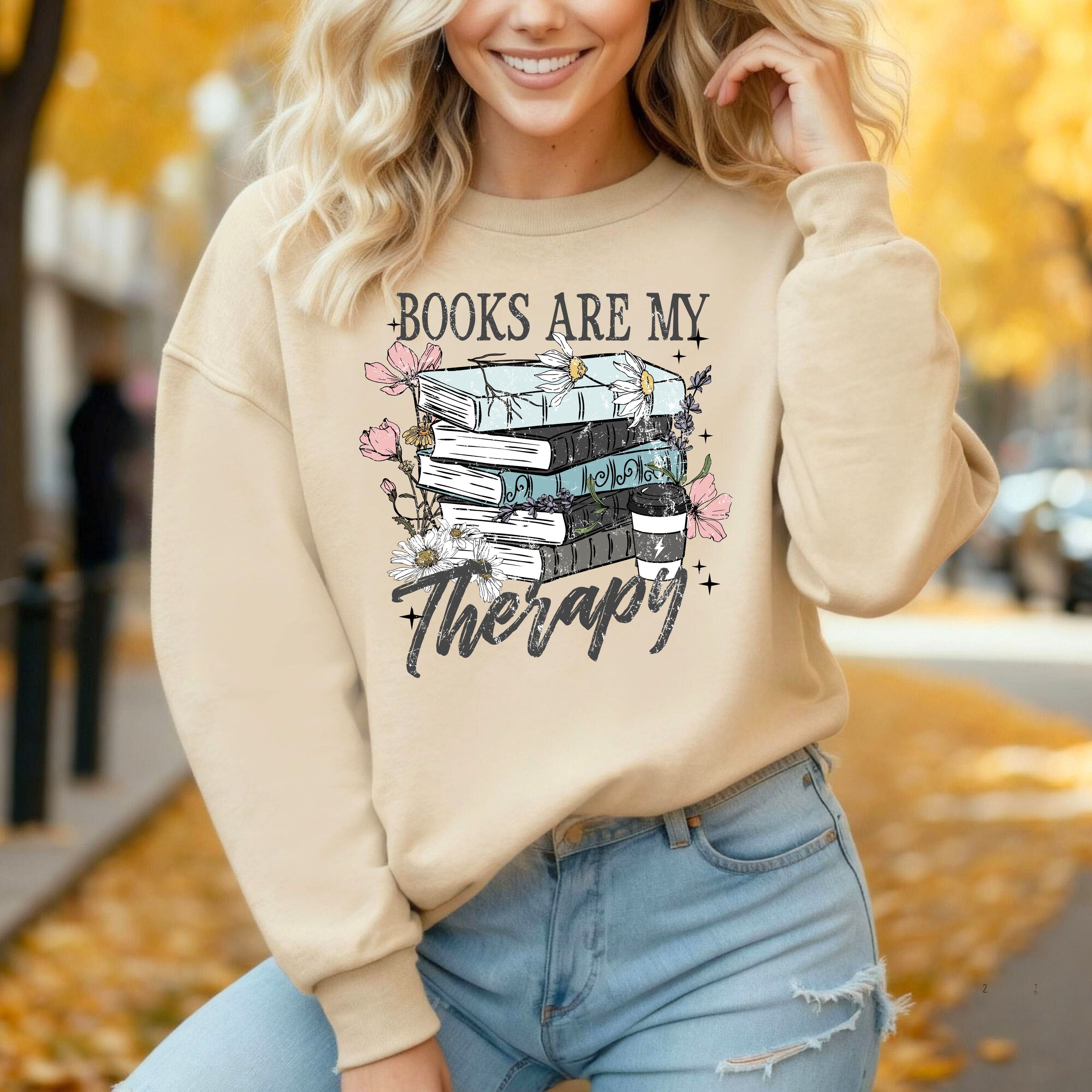 "Find comfort in the pages of a book with our Books are my Therapy Crew Sweatshirt. This cozy sweatshirt is perfect for book lovers, providing both warmth and a statement of your love for literature. Curl up with your favorite book and let the therapy begin!"