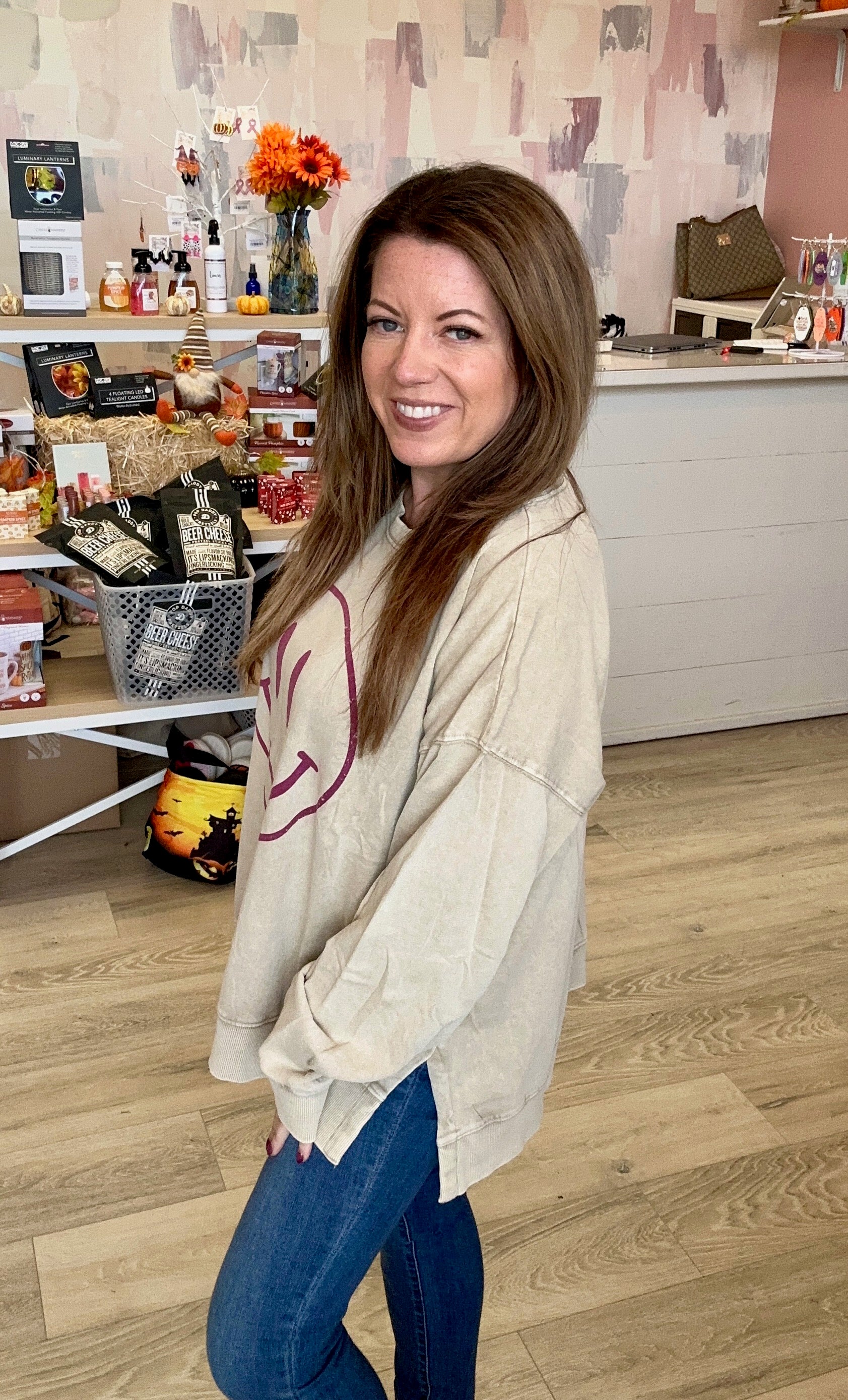 Stay cozy and cheerful in the Plus Only Smiley Pullover. Crafted from lightweight mineral-washed terry knit, this long-sleeve pullover features a playful smile face design, a comfy crew neckline, and relaxed dropped shoulders—perfect for effortless, fun layering.
