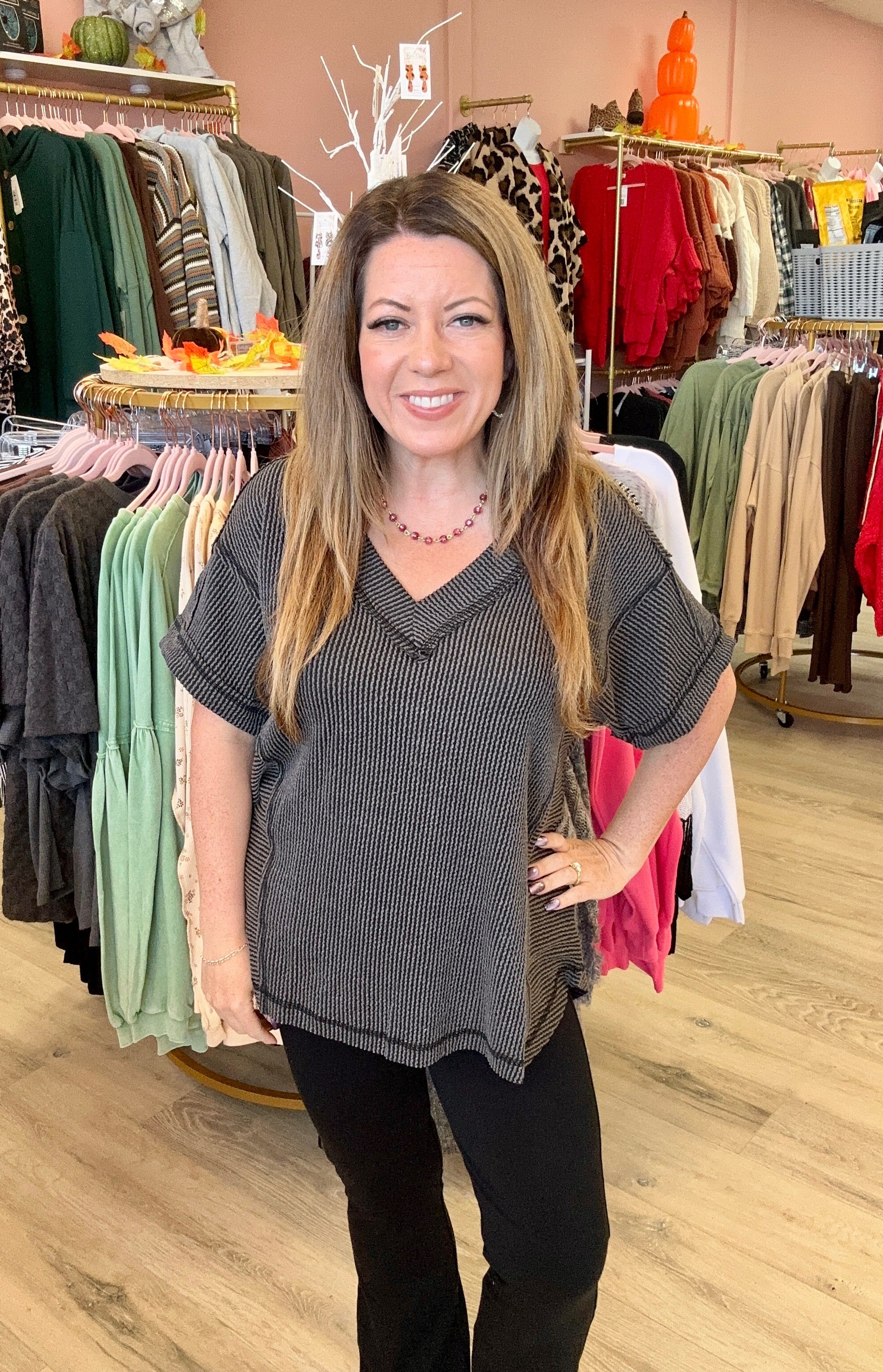 Chill, comfy, and effortlessly stylishâthis ribbed knit top in charcoal gives you that laid-back vibe with a polished twist. The two-tone detail adds a pop of style while the soft, stretchy fabric keeps you cozy all day long. Dress it up with boots and jeans or keep it casual with leggingsâeither way, itâs a wardrobe win. đ